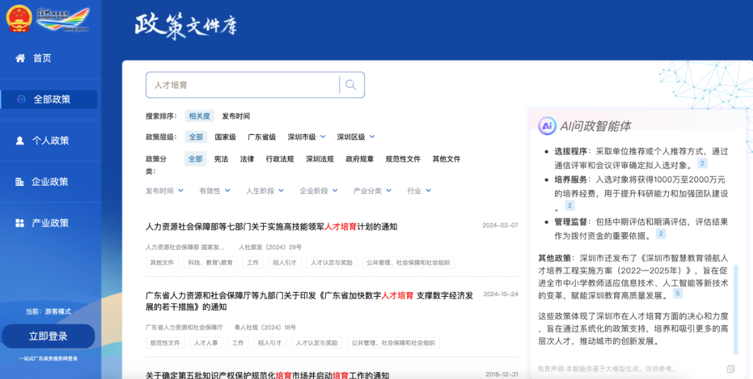 通过整合来自国家法规库、国务院、广东省、深圳市等不同层级的政策文件,形成了全面覆盖、相互关联的政策数据库。这种深度化的数据整合,使得用户能够进行跨领域、跨时期的数据查询与分析,从而更全面地了解政策背景和执行情况。